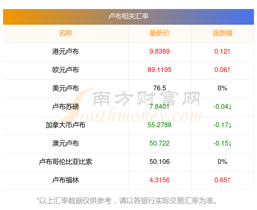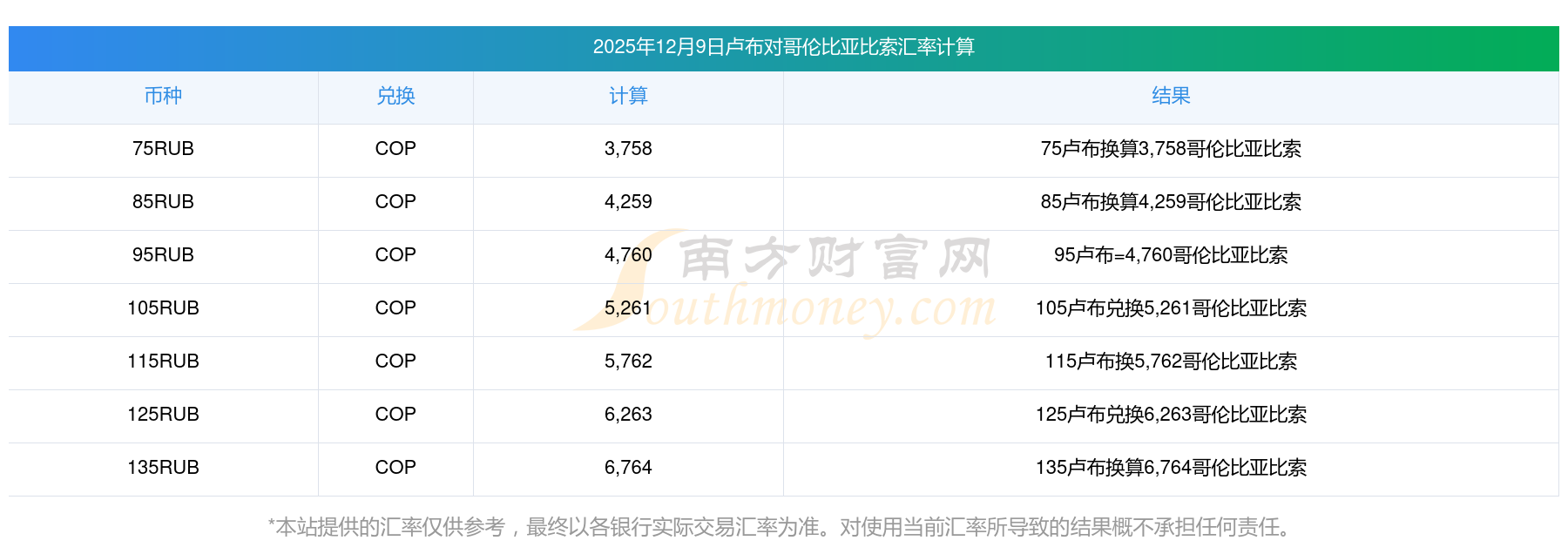 南方財(cái)富網(wǎng)為您提供盧布對(duì)哥倫比亞比索匯率最新價(jià)格詳情。