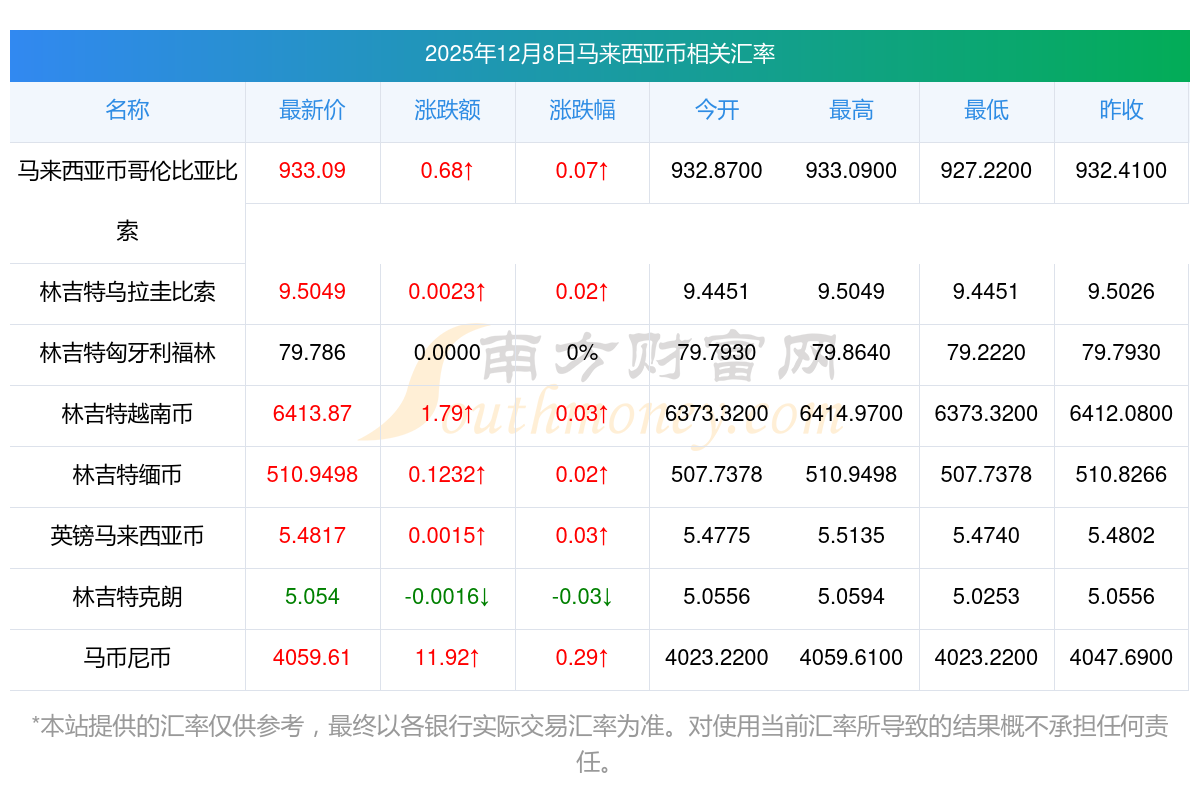 2025年12月8日馬來西亞幣相關(guān)匯率查詢