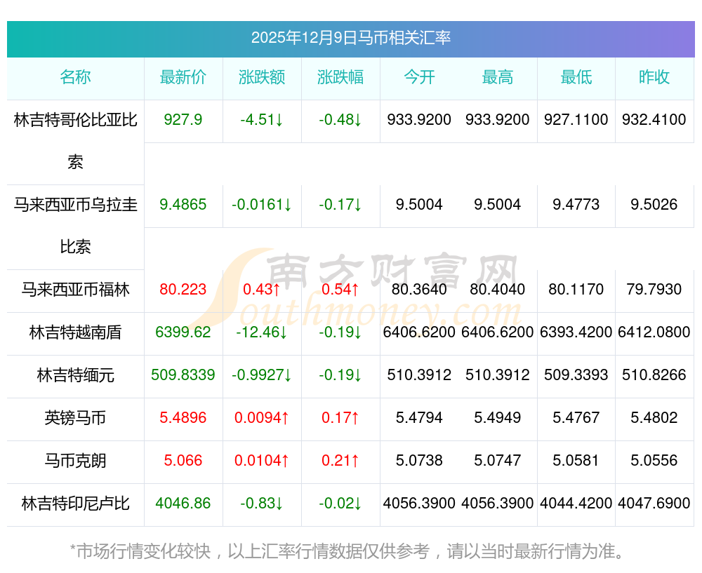 根據2025年12月9日匯率,馬幣兌換澳門幣匯率最新1.945400,今開1.9497,昨收1.9519,最高1.9497,最低1.9442。