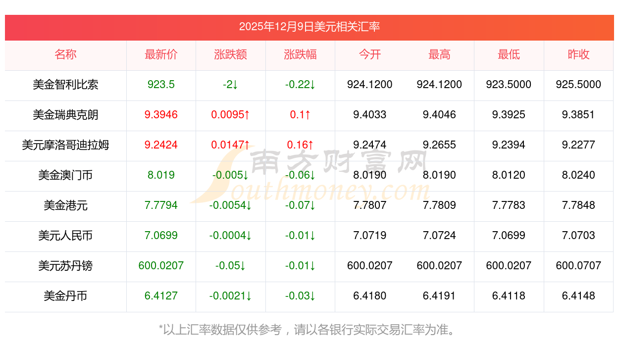 2025年12月9日美元相關(guān)匯率查詢