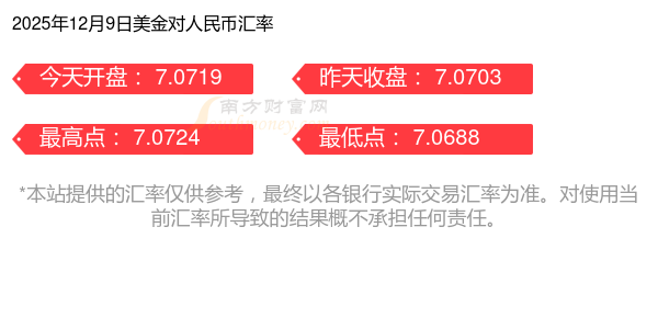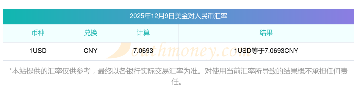 2025年12月9日美金匯價:4美金兌人民幣匯價表
