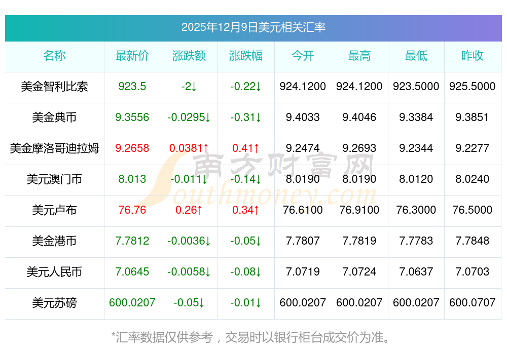 2025年12月9日美元相關匯率查詢