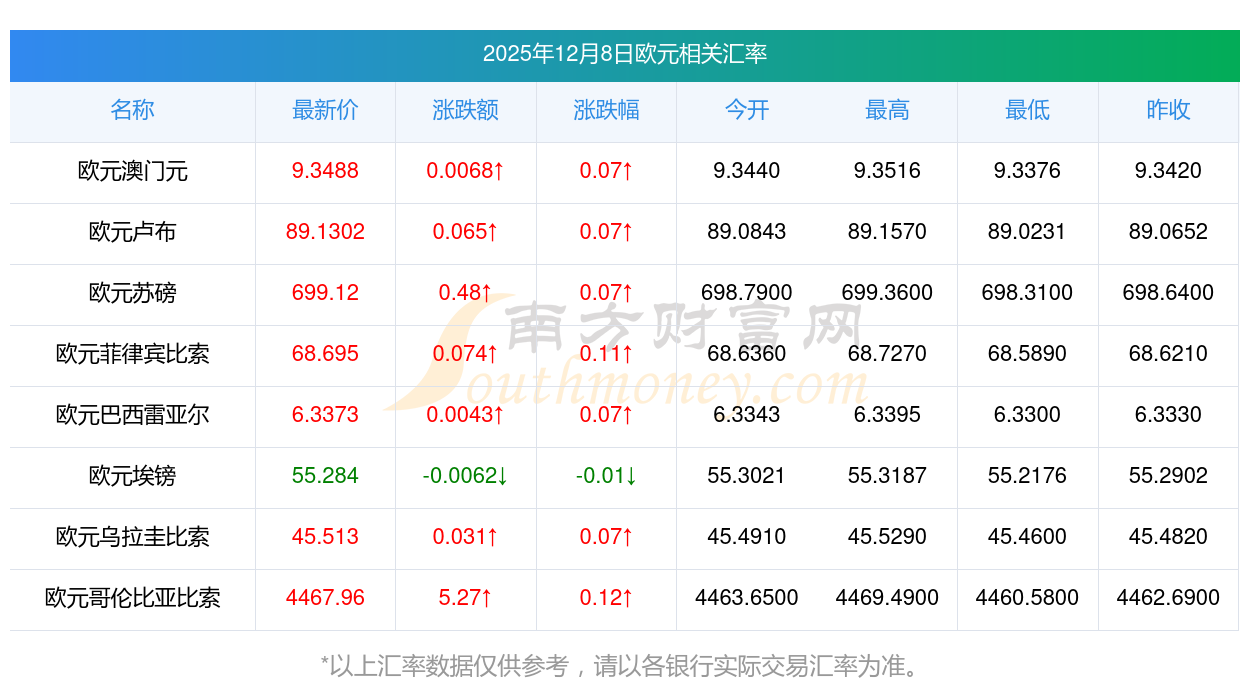 根據(jù)2025年12月8日匯率,歐元兌換挪朗匯率最新11.771900,今開11.7708,昨收11.7674,最高11.7812,最低11.7629。