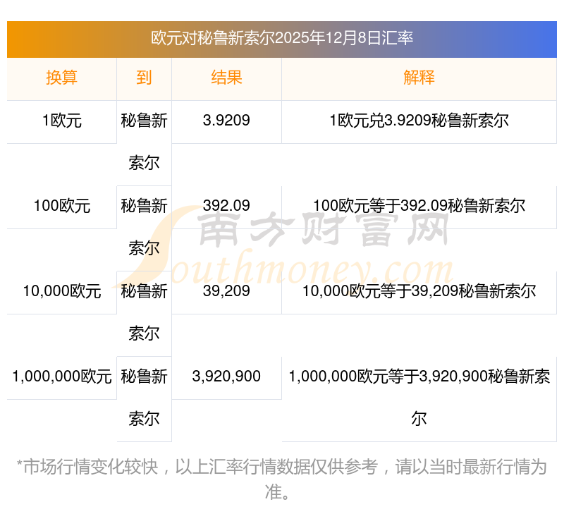 南方財富網為您提供歐元對秘魯新索爾匯率最新價格詳情。