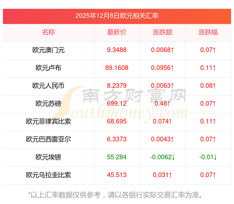 2025年12月8日歐元相關匯率查詢
