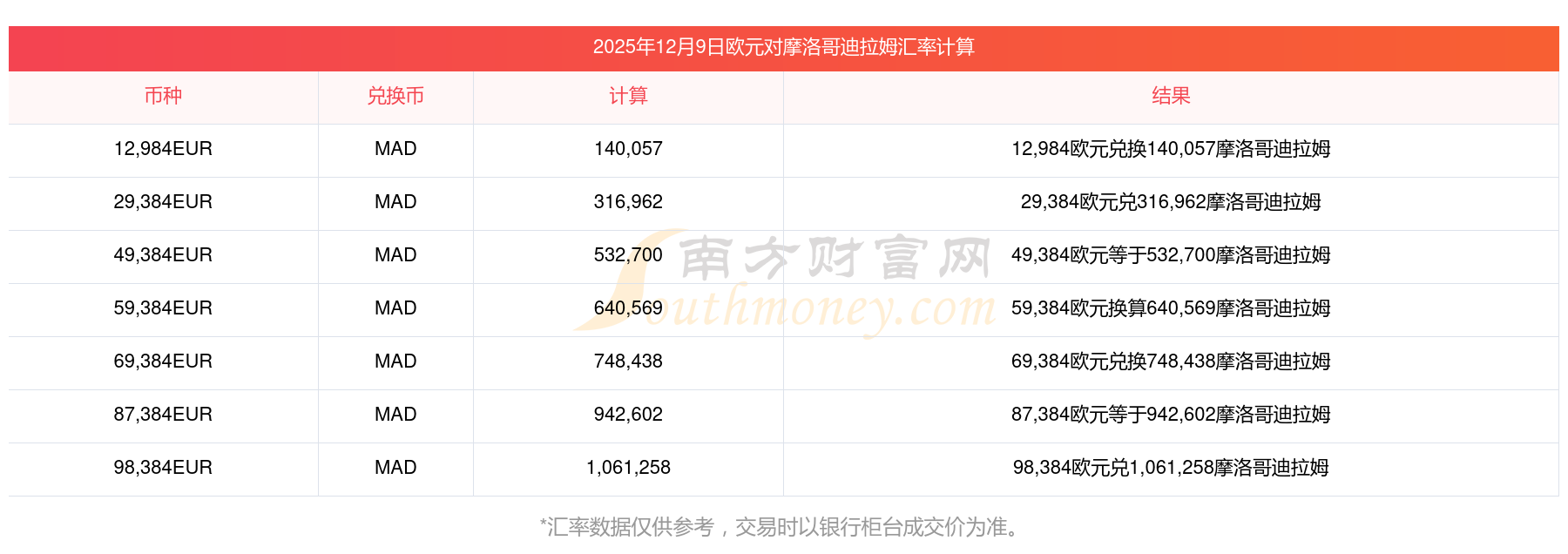 2025年12月9日歐元兌換摩洛哥迪拉姆匯率是:10.7869
