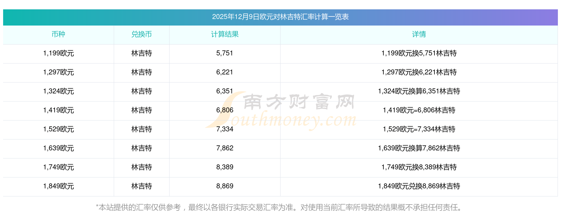 貨幣兌換:歐元兌換林吉特匯率行情(2025年12月9日)