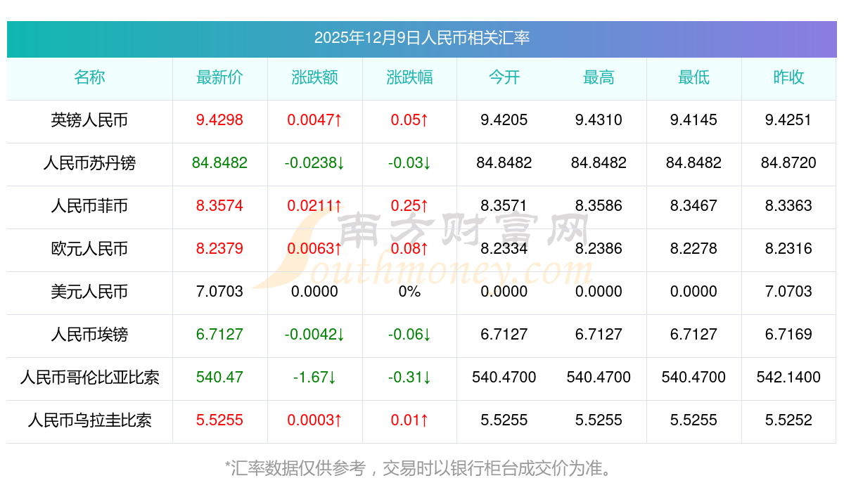 2025年12月9日最新消息,人民幣兌換哥倫比亞比索最新匯率為540.470000,今開(kāi)為540.4700,昨收為542.1400,最高為540.4700,最低為540.4700。