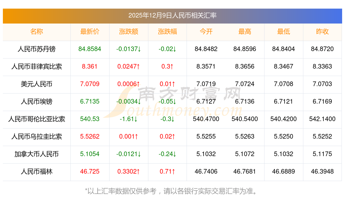 2025年12月9日人民幣相關(guān)匯率查詢