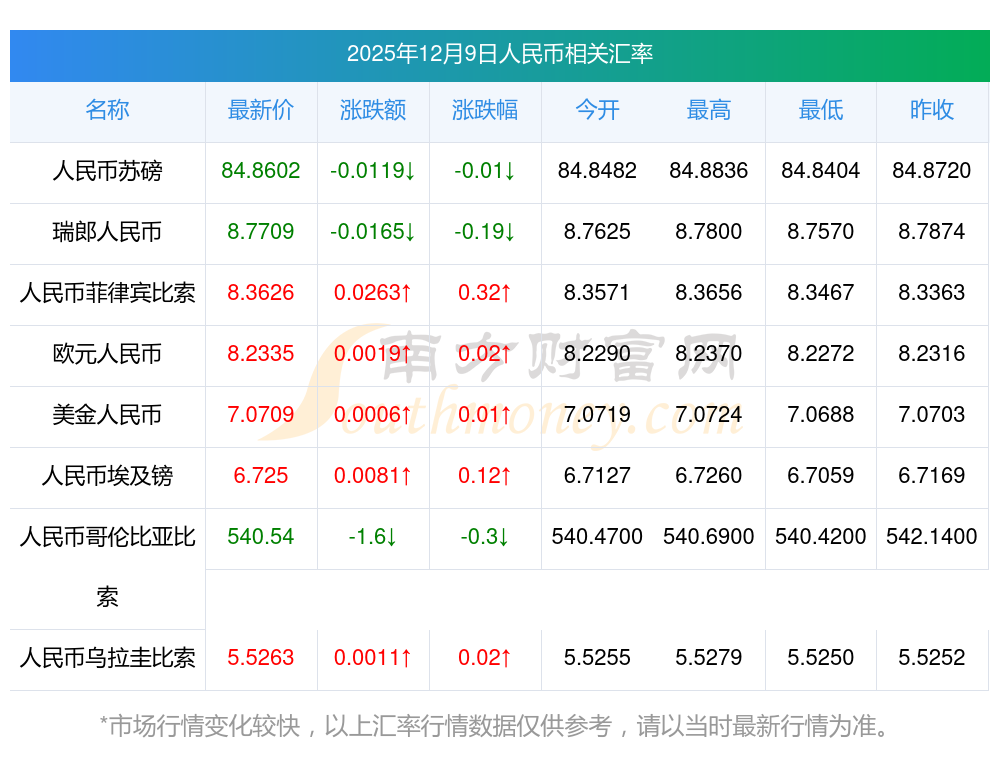 匯率在每一分鐘或都不盡相同,請以實際兌換或交易時的匯率為準,您或許看到有些數(shù)據(jù)延遲或提前發(fā)布,這是由于數(shù)據(jù)公布機構(gòu)有時未必會準時發(fā)布所導(dǎo)致,請以實際為準。