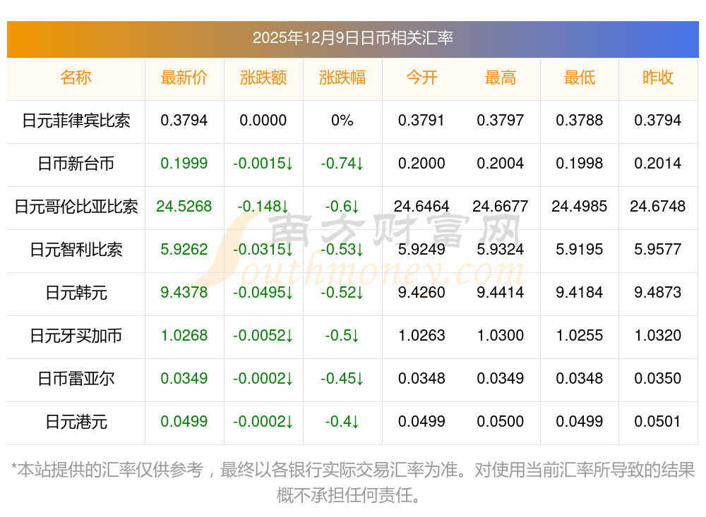根據(jù)2025年12月9日匯率,日幣兌換烏拉圭比索匯率最新價0.250689,今開價0.2515,昨收價0.2515,最高價0.2522,最低價0.2504。