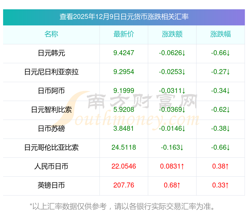 2025年12月9日最新消息,日元兌換智利比索最新匯率為5.920800,今開為5.9249,昨收為5.9577,最高為5.9324,最低為5.9157。