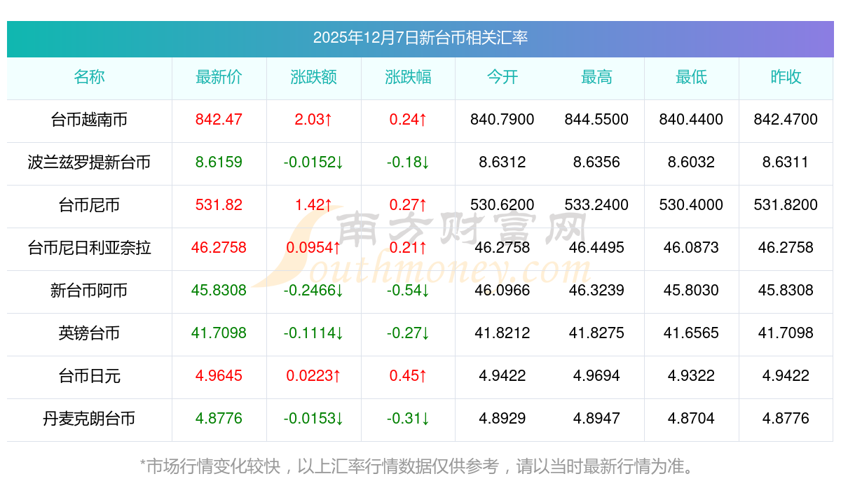 根據(jù)2025年12月7日匯率計算,TWD兌換MOP匯率最新價0.256500:今開價0.2565,昨收價0.2565,最高價0.2569,最低價0.2556。