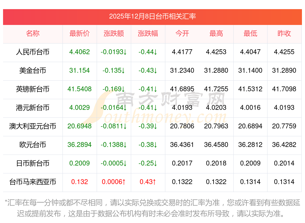 2025年12月8日最新消息,臺幣兌換馬來西亞幣最新匯率為0.131951,今開為0.1322,昨收為0.1314,最高為0.1322,最低為0.1314。
