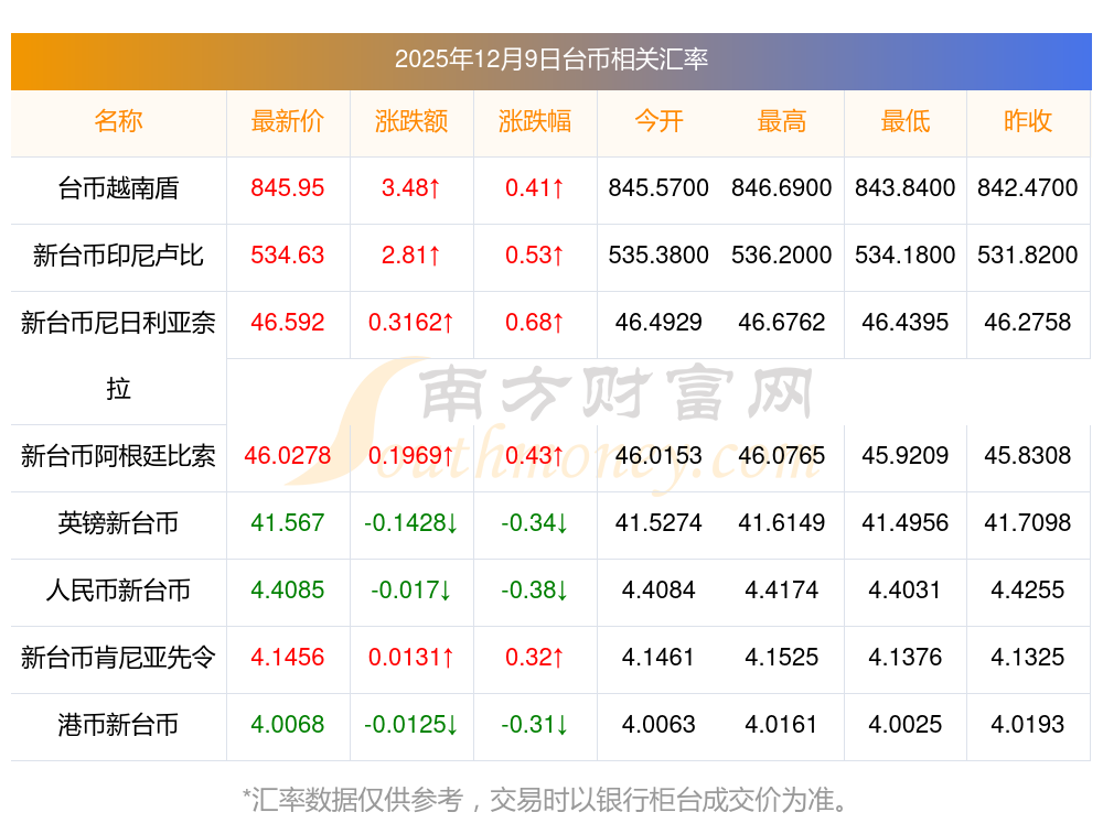 2025年12月9日臺(tái)幣相關(guān)匯率查詢