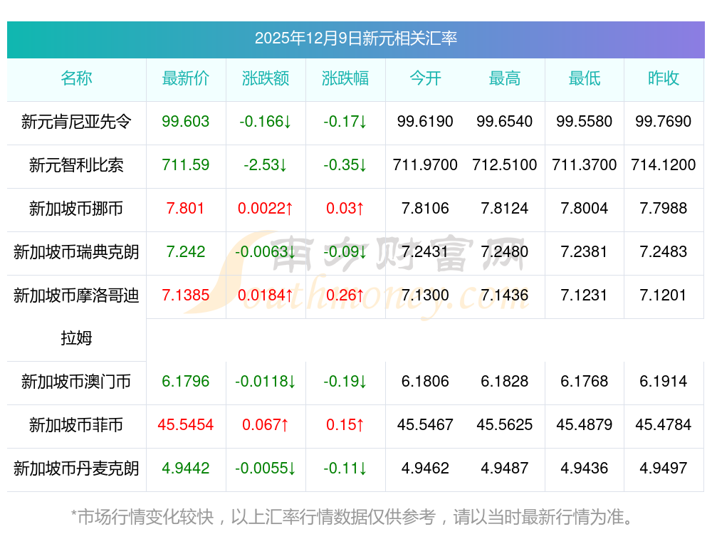 根據(jù)2025年12月9日匯率計(jì)算,SGD兌換CLP匯率最新價(jià)711.590000:今日開價(jià)711.9700,昨日收價(jià)714.1200,最高價(jià)712.5100,最低價(jià)711.3700。
