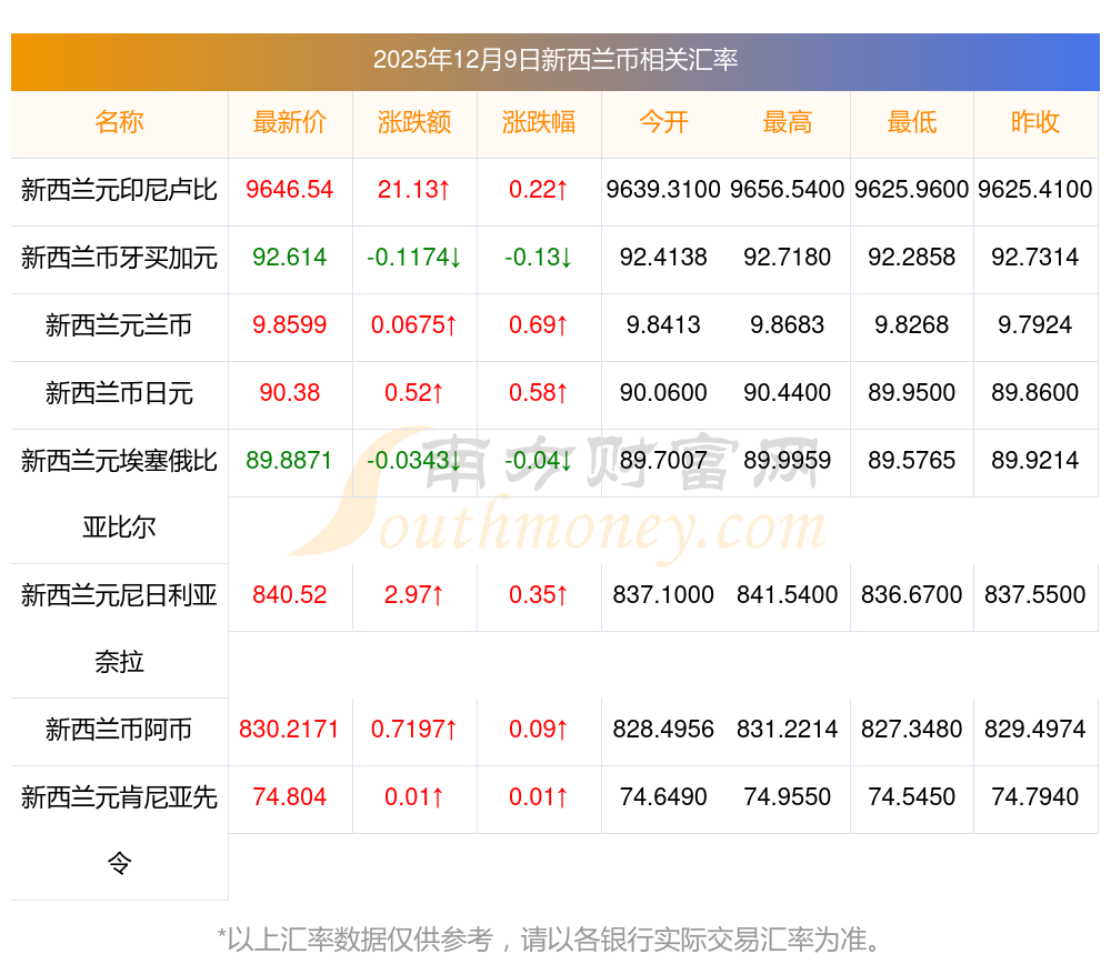 2025年12月9日新西蘭幣相關(guān)匯率查詢
