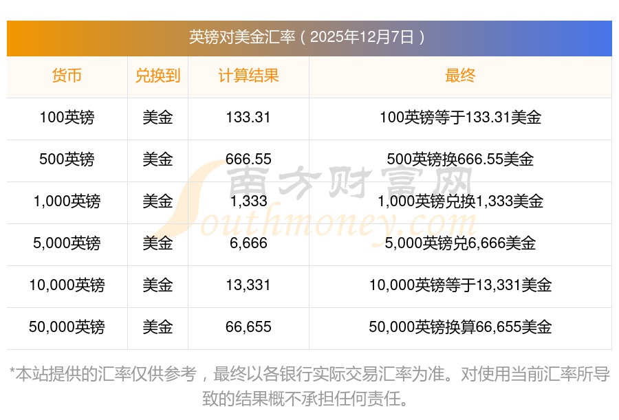 現(xiàn)在5英鎊與美元的匯率是多少?12月7日