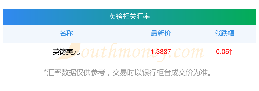 根據(jù)2025年12月8日匯率,英鎊兌換美元匯率最新1.333700,今開1.3324,昨收1.3331,最高1.3339,最低1.3316。
