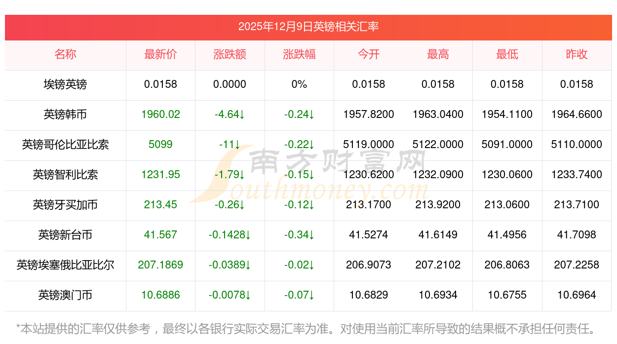 2025年12月9日英鎊相關(guān)匯率查詢