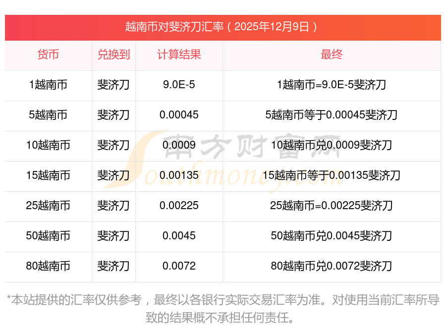 2025年12月9日貨幣兌換:1越南幣等于9.0E-5斐濟(jì)刀。舉例:假如一瓶礦泉水需要1越南幣,則需斐濟(jì)刀:9.0E-5斐濟(jì)刀。