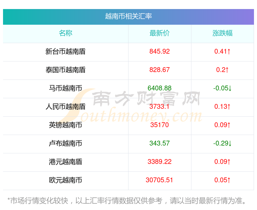 南方財(cái)富網(wǎng)為您提供越南幣對(duì)泰銖匯率最新價(jià)格詳情。