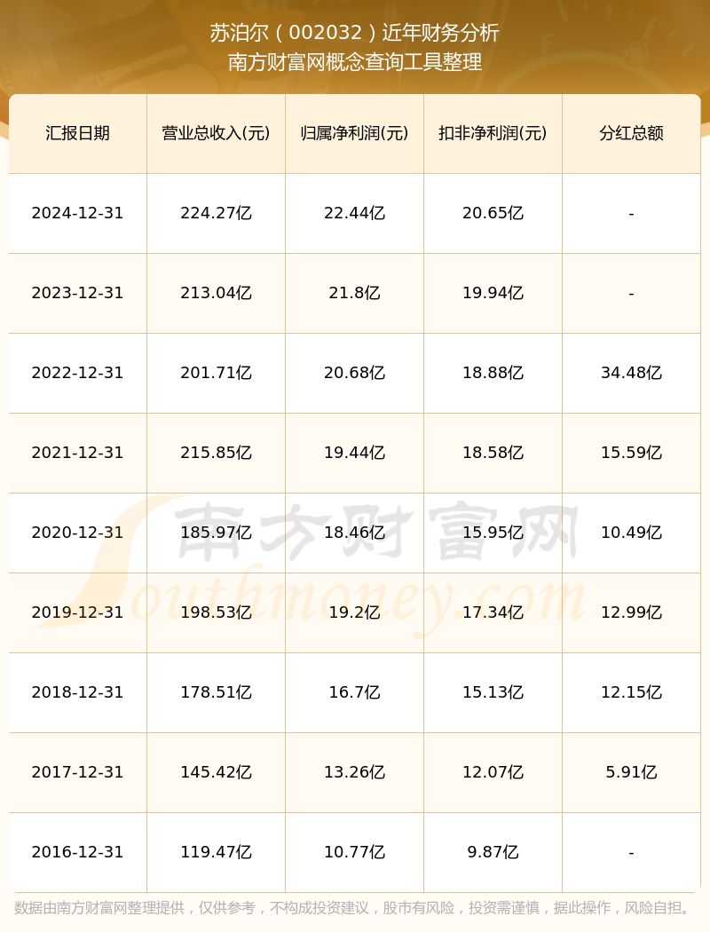 2024年蘇泊爾總營收224.27億,同比增長5.27%;凈利潤22.44億,同比增長2.97%;銷售毛利率24.65%。