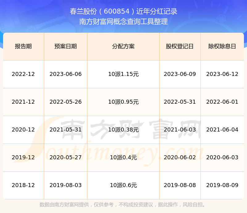 春蘭股份最新一次公布的分紅方案為10派1.15元。本次權(quán)益分派股權(quán)登記日為2023年6月9日,除權(quán)除息日為2023年6月12日,派息日為2023年6月12日。