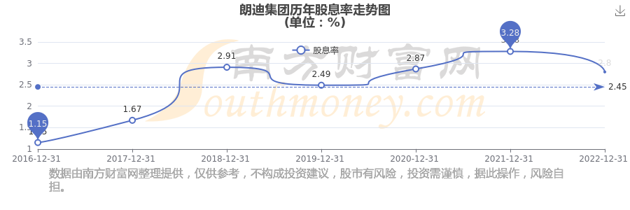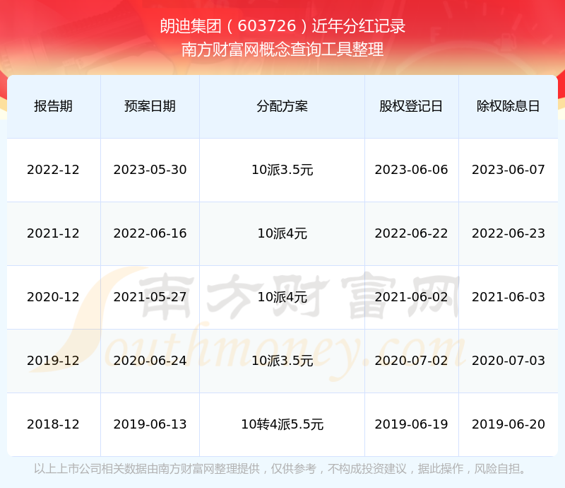 朗迪集團最新一次公布的分紅方案為10派3.5元。本次權益分派股權登記日為2023年6月6日,除權除息日為2023年6月7日,派息日為2023年6月7日。