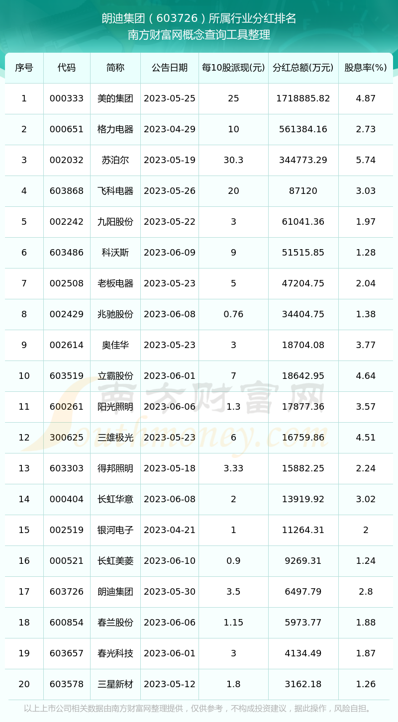 按照南方財富網(wǎng)趨勢選股系統(tǒng)統(tǒng)計,朗迪集團所屬行業(yè)為空調(diào)風葉行業(yè),空調(diào)風葉行業(yè)分紅排名情況如下表: