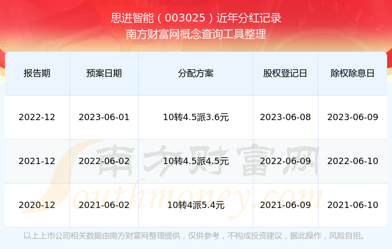 思進(jìn)智能最新一次公布的分紅方案為10轉(zhuǎn)4.5派3.6元。本次權(quán)益分派股權(quán)登記日為2023年6月8日,除權(quán)除息日為2023年6月9日,派息日為2023年6月9日。