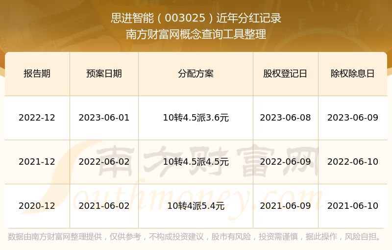 思進(jìn)智能最新一次公布的分紅方案為10轉(zhuǎn)4.5派3.6元。本次權(quán)益分派股權(quán)登記日為2023年6月8日,除權(quán)除息日為2023年6月9日,派息日為2023年6月9日。
