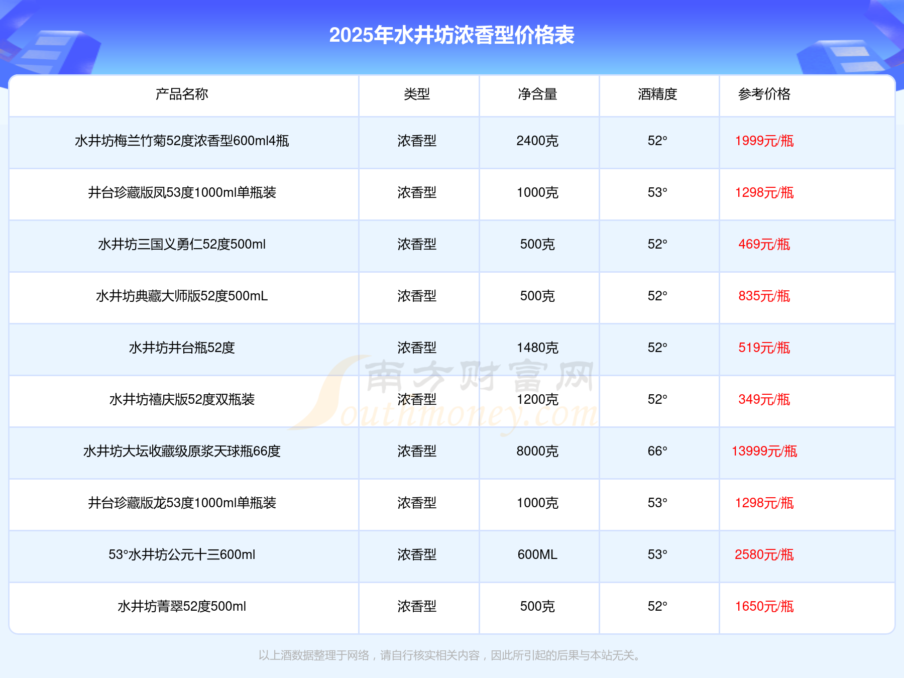 2025水井坊濃香型酒最新價(jià)格:水井坊大壇收藏級(jí)原漿天球瓶66度參考價(jià)13999元/瓶、水井坊博物館壹號(hào)53度雙瓶裝參考價(jià)10988元/瓶、53°水井坊公元十三600ml參考價(jià)2580元/瓶、水井坊梅蘭竹菊52度濃香型600ml4瓶參考價(jià)1999元/瓶、水井坊菁翠52度500ml參考價(jià)1650元/瓶。