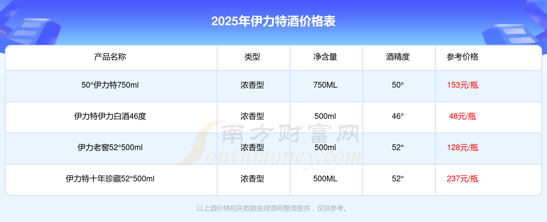 2025年伊力特酒伊力特十年珍藏52°500ml、50°伊力特750ml、伊力老窖52°500ml等最新價(jià)格如下: