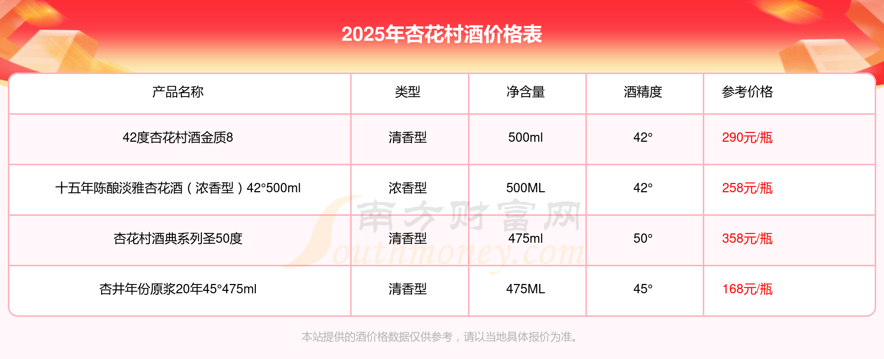 杏花村酒最新價(jià)格2025:杏花村酒典系列圣50度參考價(jià)358元/瓶、42度杏花村酒金質(zhì)8參考價(jià)290元/瓶、十五年陳釀淡雅杏花酒(濃香型)42°500ml參考價(jià)258元/瓶、杏井年份原漿20年45°475ml參考價(jià)168元/瓶。