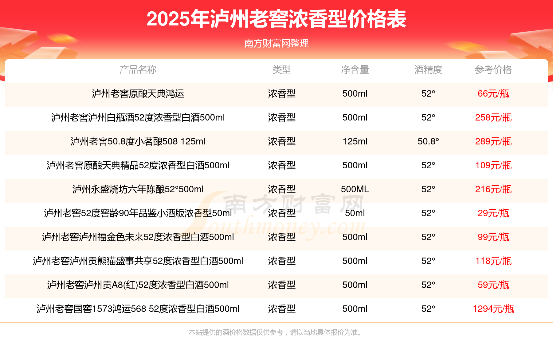 2025年瀘州老窖濃香型酒瀘州老窖國窖1573春釀鼠兆豐年E 55度、瀘州老窖國窖1573生命中的那壇酒55度014、瀘州老窖國窖1573春釀鼠兆豐年A 55度、瀘州老窖國窖1573生命中的那壇酒55度013濃香型白酒1000ml等最新價格如下:瀘州老窖國窖1573春釀鼠兆豐年E 55度參考價17999元/瓶、瀘州老窖國窖1573生命中的那壇酒55度014參考價9999元/瓶、瀘州老窖國窖1573春釀鼠兆豐年A 55度參考價5088元/瓶、瀘州老窖國窖1573生命中的那壇酒55度013濃香型白酒1000ml參考價4988元/瓶。