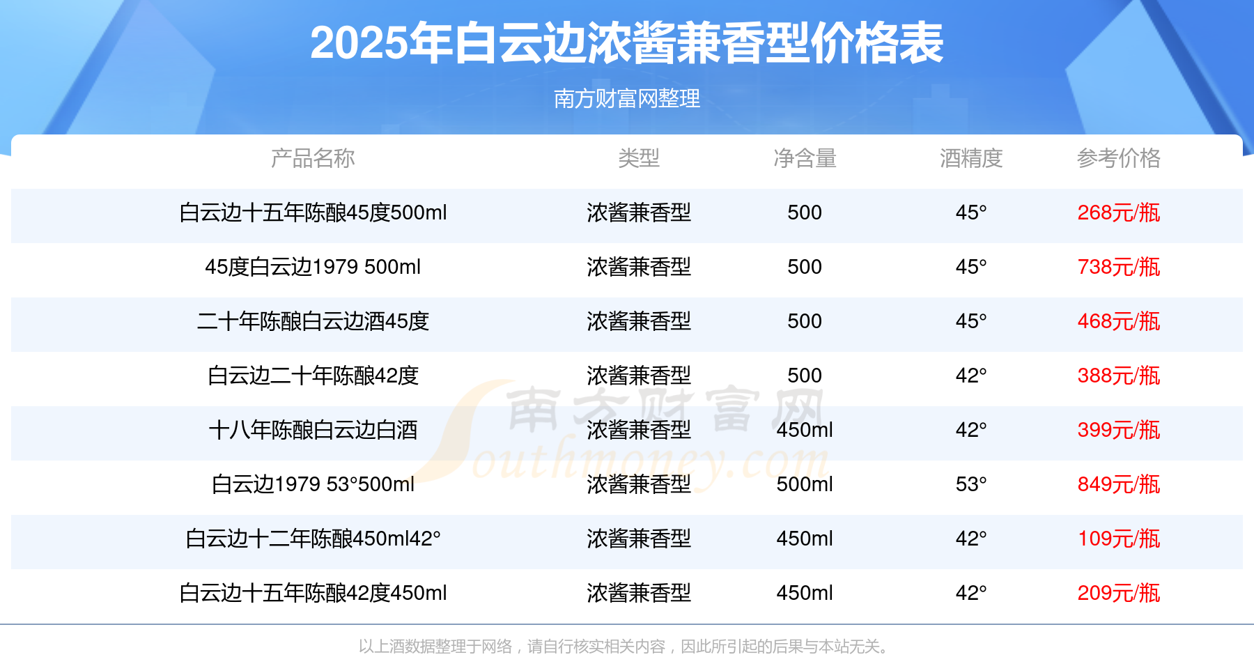 2025年,白云邊1979 53°500ml、45度白云邊1979 500ml、二十年陳釀白云邊酒45度、十八年陳釀白云邊白酒、白云邊二十年陳釀42度、白云邊十五年陳釀45度500ml、白云邊十五年陳釀42度450ml等白云邊濃醬兼香型酒價格如下:白云邊1979 53°500ml參考價849元/瓶、45度白云邊1979 500ml參考價738元/瓶、二十年陳釀白云邊酒45度參考價468元/瓶、十八年陳釀白云邊白酒參考價399元/瓶、白云邊二十年陳釀42度參考價388元/瓶、白云邊十五年陳釀45度500ml參考價268元/瓶、白云邊十五年陳釀42度450ml參考價209元/瓶。