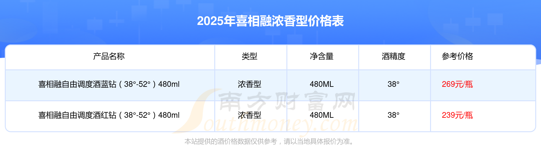 2025年,喜相融自由調(diào)度酒藍鉆(38°-52°)480ml、喜相融自由調(diào)度酒紅鉆(38°-52°)480ml等喜相融濃香型酒價格如下:喜相融自由調(diào)度酒藍鉆(38°-52°)480ml參考價269元/瓶、喜相融自由調(diào)度酒紅鉆(38°-52°)480ml參考價239元/瓶。