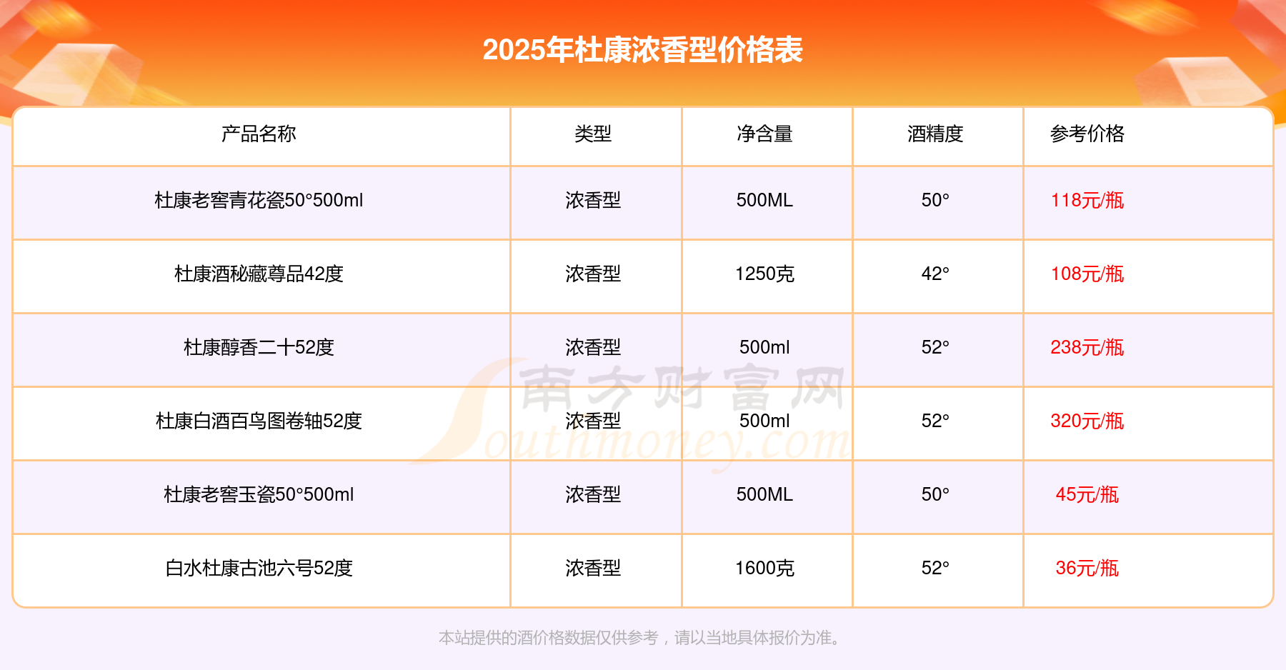 杜康濃香型酒最新價格2025:杜康白酒百鳥圖卷軸52度參考價320元/瓶、杜康醇香二十52度參考價238元/瓶、杜康老窖青花瓷50°500ml參考價118元/瓶。