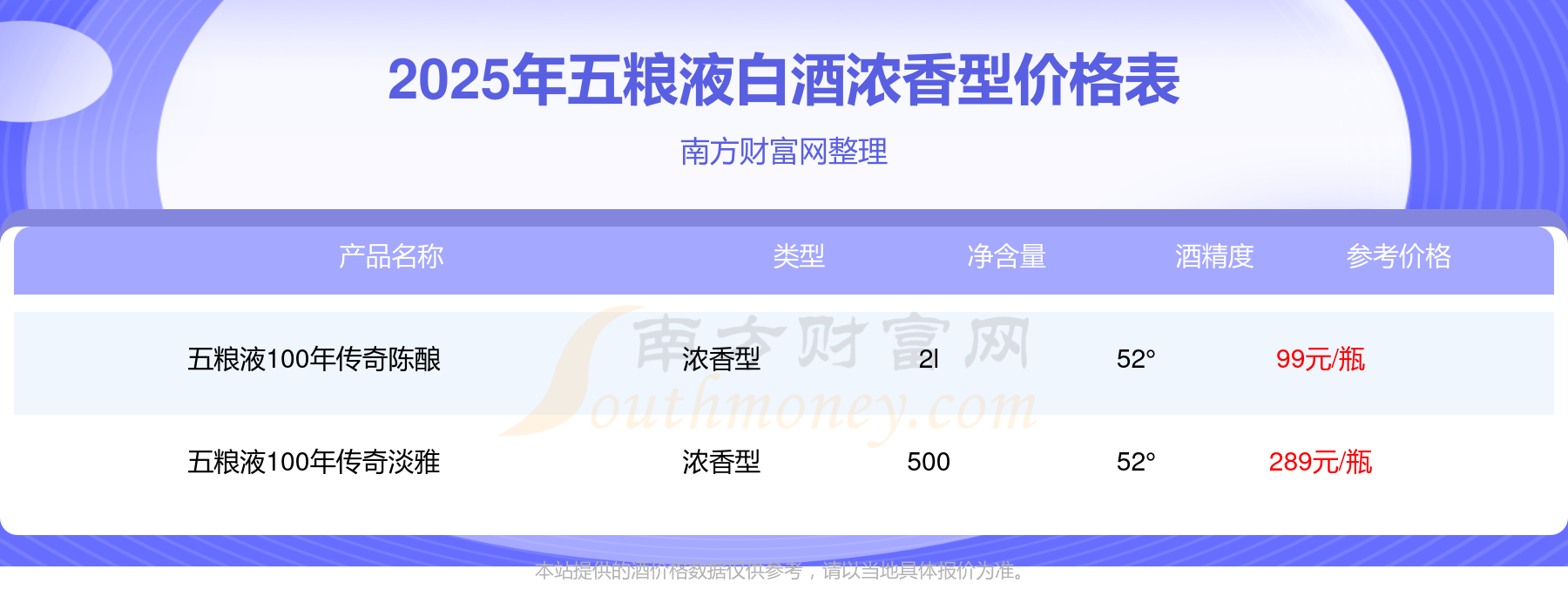 2025年,五糧液100年傳奇淡雅、五糧液100年傳奇陳釀等五糧液白酒濃香型酒價(jià)格如下:五糧液100年傳奇淡雅參考價(jià)289元/瓶、五糧液100年傳奇陳釀參考價(jià)99元/瓶。