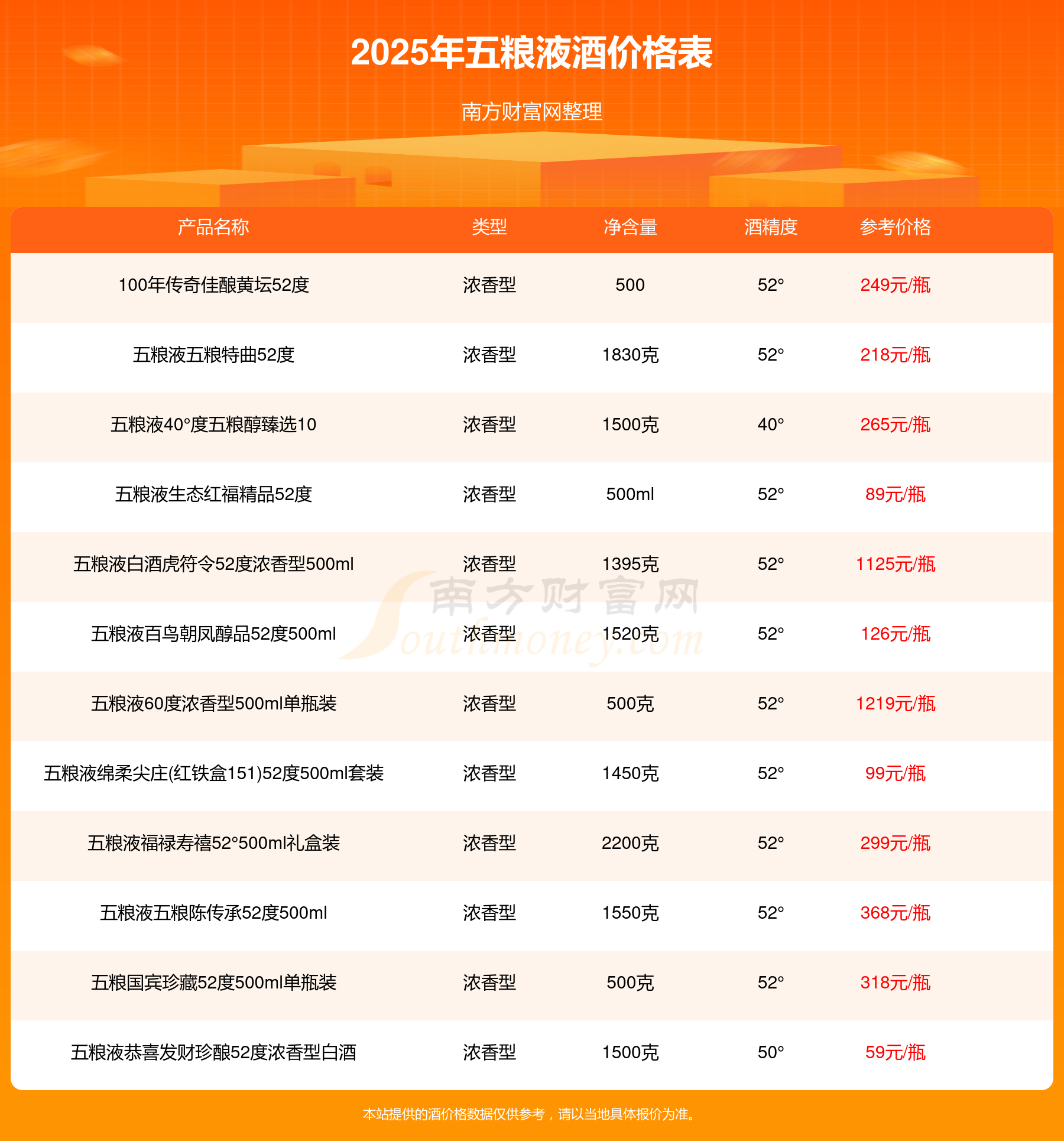 當下五糧液酒價格最高的酒為五糧液百年世博世紀榮耀紀念酒60°999ml,參考價26980元/瓶,而五糧液酒價格最低的是五糧液干一杯小瓶46度,參考價16元/瓶,價格高低差為26964元/瓶。
