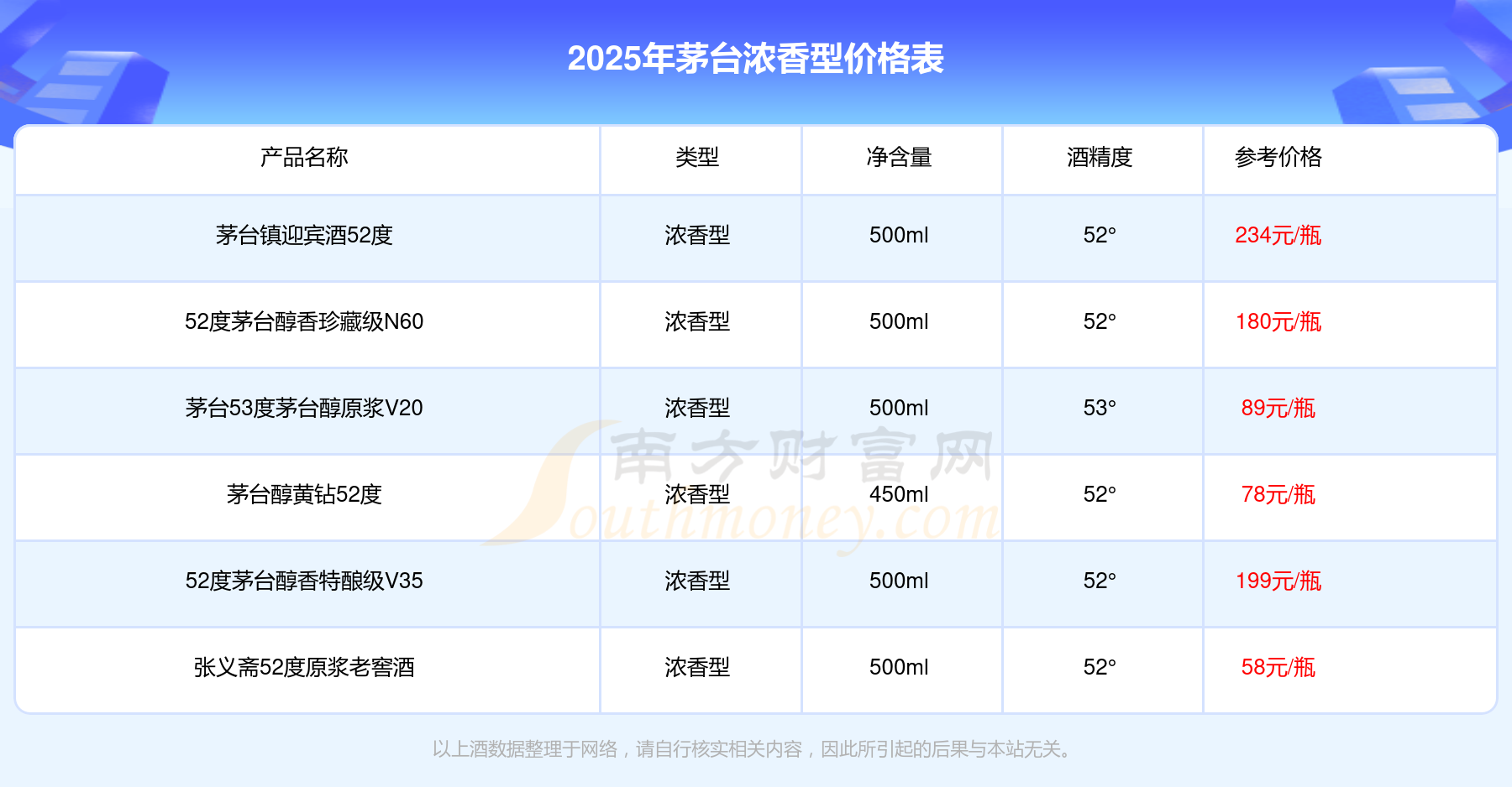 2025年,茅臺(tái)鎮(zhèn)迎賓酒52度、52度茅臺(tái)醇香特釀級(jí)V35、52度茅臺(tái)醇香珍藏級(jí)N60、茅臺(tái)53度茅臺(tái)醇原漿V20、茅臺(tái)醇黃鉆52度、張義齋52度原漿老窖酒等茅臺(tái)濃香型酒價(jià)格如下:茅臺(tái)鎮(zhèn)迎賓酒52度參考價(jià)234元/瓶、52度茅臺(tái)醇香特釀級(jí)V35參考價(jià)199元/瓶、52度茅臺(tái)醇香珍藏級(jí)N60參考價(jià)180元/瓶、茅臺(tái)53度茅臺(tái)醇原漿V20參考價(jià)89元/瓶、茅臺(tái)醇黃鉆52度參考價(jià)78元/瓶、張義齋52度原漿老窖酒參考價(jià)58元/瓶。
