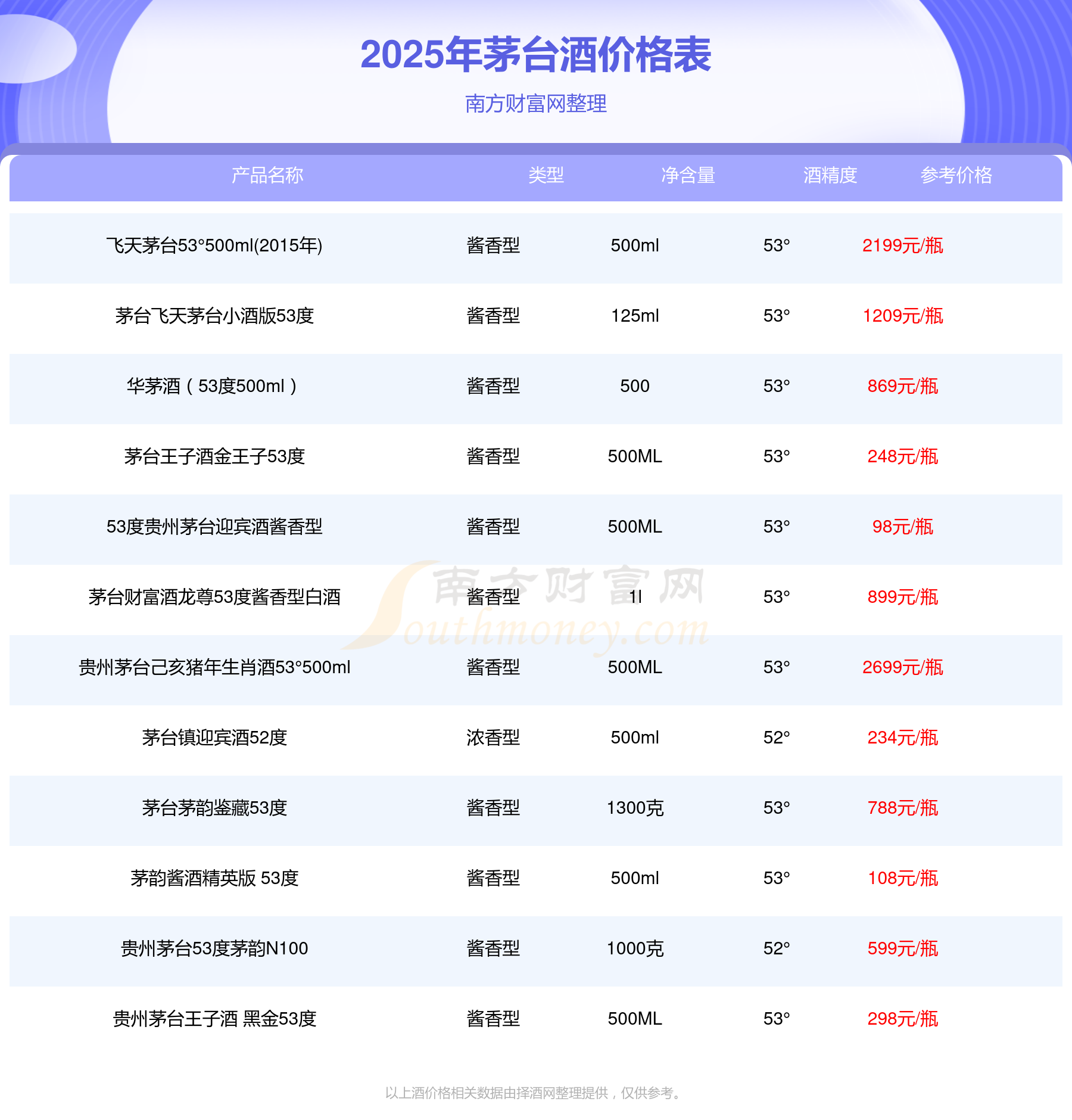 2025年茅臺(tái)酒華茅鑒藏 醬香型白酒 3L 53°、53度五星茅臺(tái)生肖酒丁酉雞年、貴州茅臺(tái)己亥豬年生肖酒53°500ml、53度五星茅臺(tái)生肖酒戊戌狗年、飛天茅臺(tái)53°500ml(2015年)等最新價(jià)格如下: