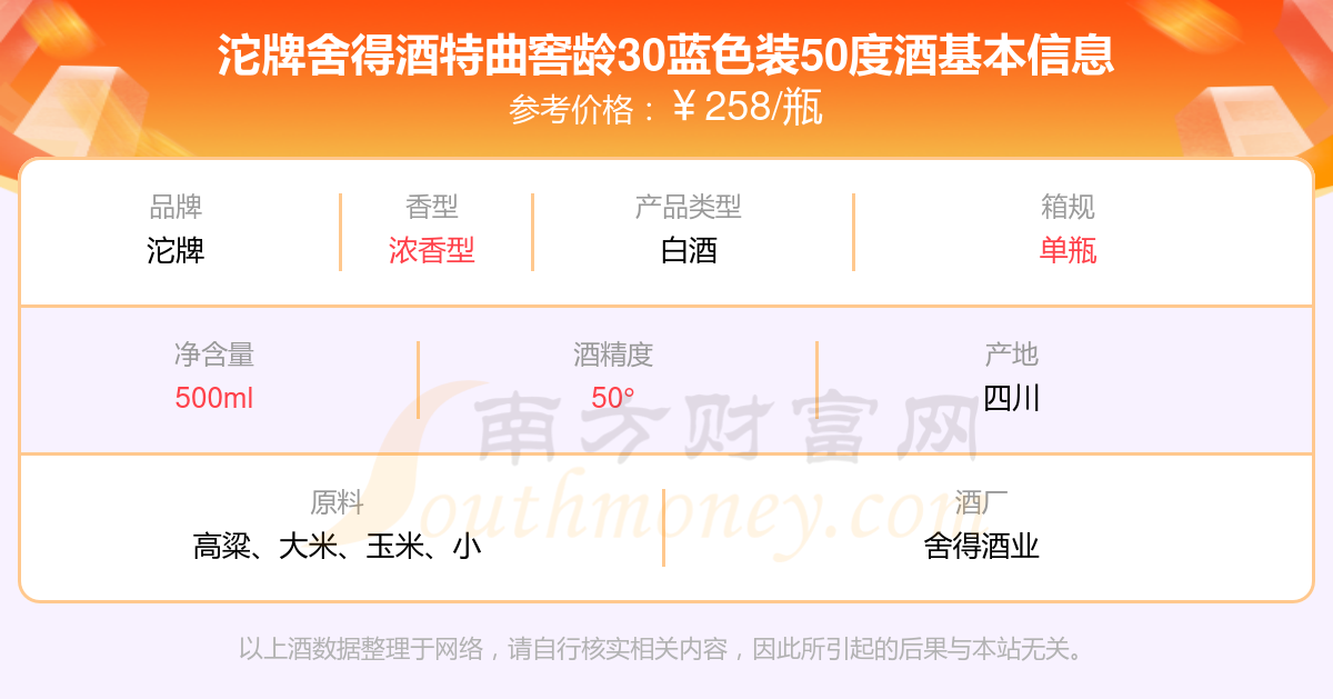 沱牌舍得酒特曲窖齡30藍色裝50度基本信息
