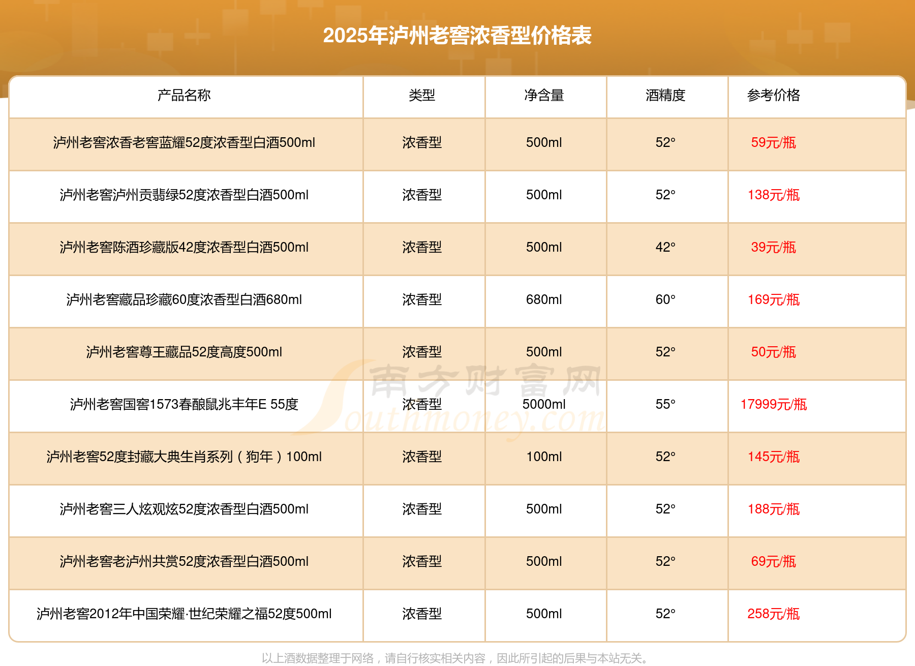 2025年瀘州老窖濃香型價格最高的酒是瀘州老窖國窖1573春釀鼠兆豐年E 55度,參考價17999元/瓶,最低的是瀘州老窖45度五洲醉8窖經(jīng)典小酒版濃香型100ml,參考價10元/瓶,價格高低差為17989元/瓶。