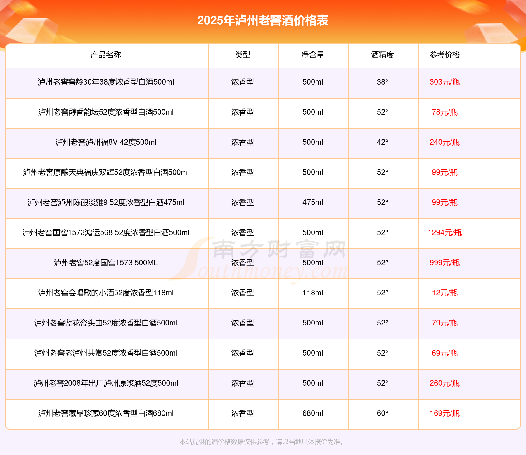 目前,瀘州老窖酒價格最高的酒為瀘州老窖國窖1573春釀鼠兆豐年E 55度,參考價17999元/瓶,而瀘州老窖酒價格最低的是瀘州老窖45度五洲醉8窖經(jīng)典小酒版濃香型100ml,參考價10元/瓶,價格高低差為17989元/瓶。