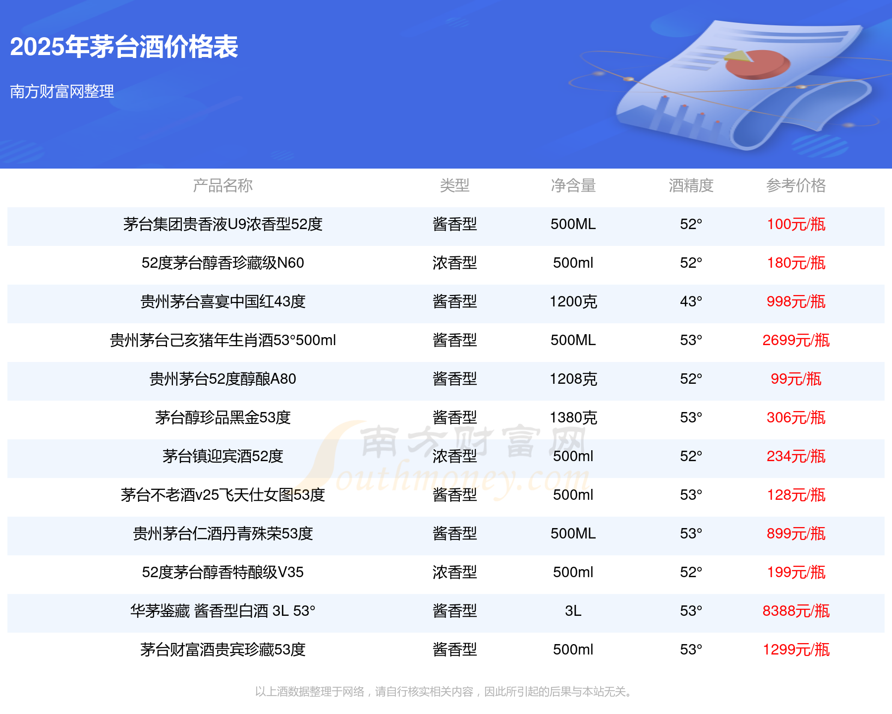 茅臺(tái)酒最新價(jià)格2025:華茅鑒藏 醬香型白酒 3L 53°參考價(jià)8388元/瓶、53度五星茅臺(tái)生肖酒丁酉雞年參考價(jià)2798元/瓶、貴州茅臺(tái)己亥豬年生肖酒53°500ml參考價(jià)2699元/瓶。