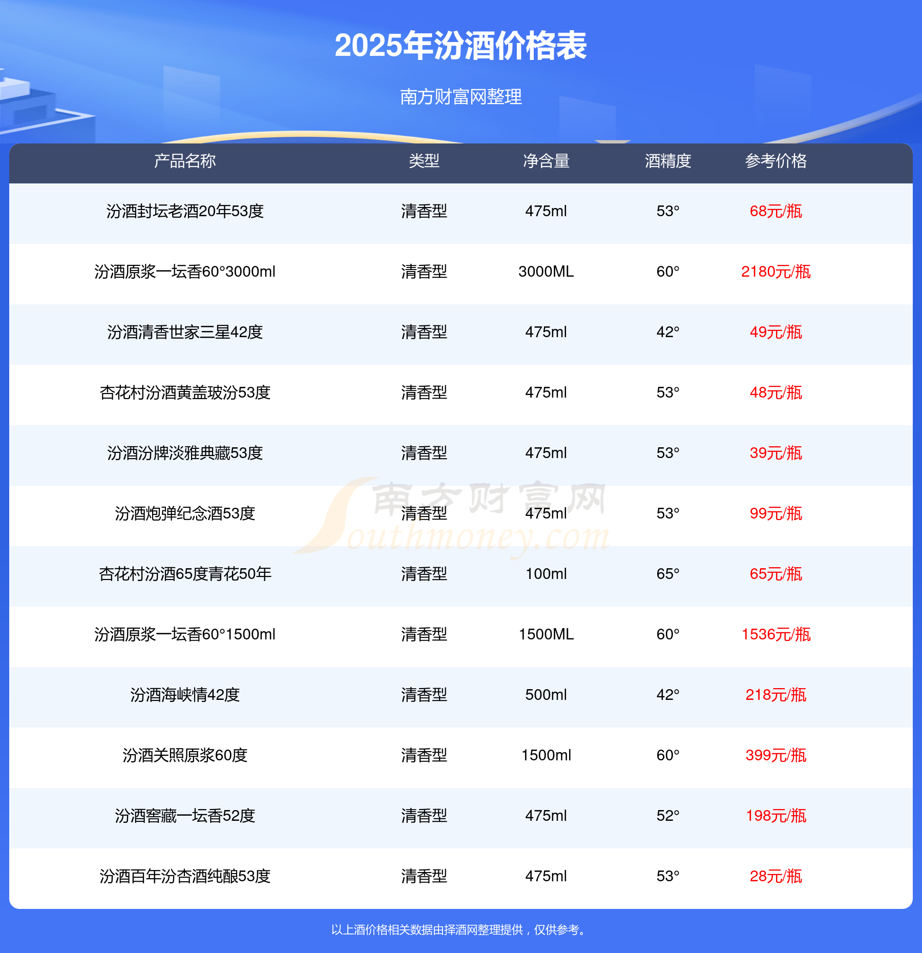 汾酒原漿一壇香60°3000ml參考價2180元/瓶、汾酒原漿一壇香60°1500ml參考價1536元/瓶、42度汾酒青花25參考價598元/瓶、汾酒收藏系列盤古汾酒55度參考價400元/瓶、汾酒關(guān)照原漿60度參考價399元/瓶、汾酒青花20單瓶禮盒裝參考價388元/瓶、汾酒海峽情42度參考價218元/瓶。