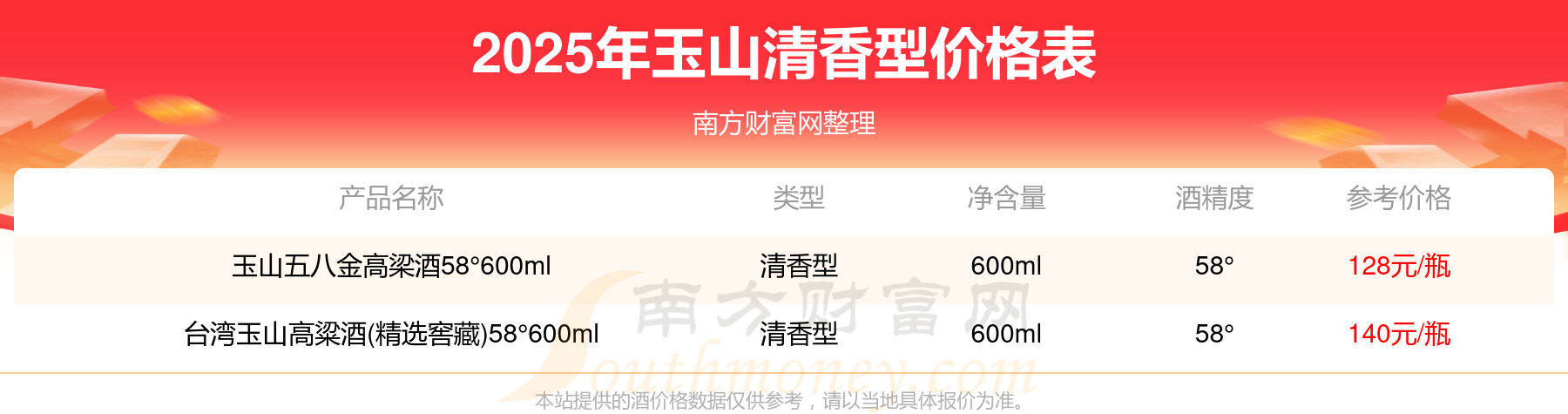 2025年,臺灣玉山高粱酒(精選窖藏)58°600ml、玉山五八金高梁酒58°600ml等玉山清香型酒價格如下: