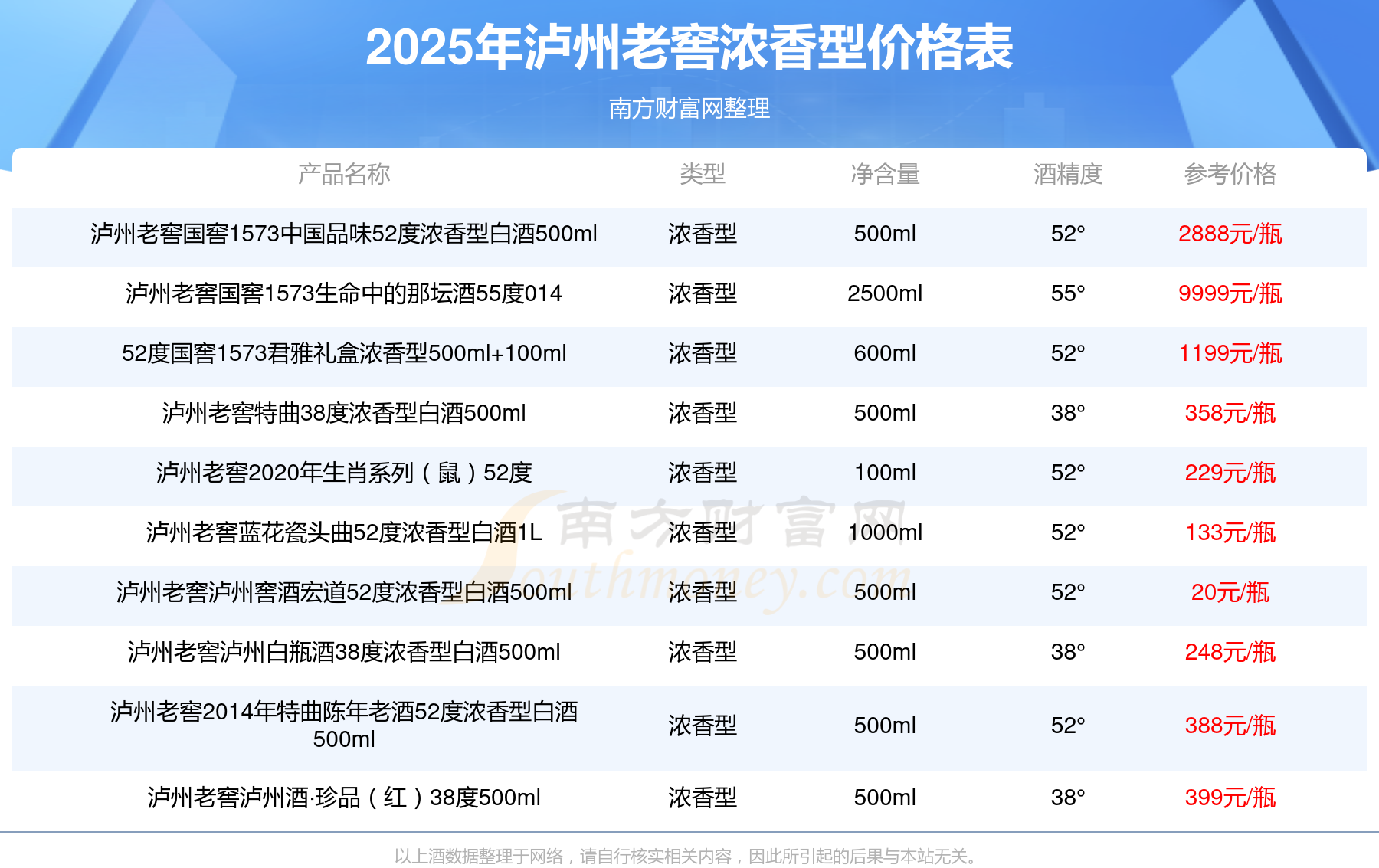 瀘州老窖國窖1573春釀鼠兆豐年E 55度參考價17999元/瓶、瀘州老窖國窖1573生命中的那壇酒55度014參考價9999元/瓶、瀘州老窖國窖1573春釀鼠兆豐年A 55度參考價5088元/瓶、瀘州老窖國窖1573生命中的那壇酒55度013濃香型白酒1000ml參考價4988元/瓶、瀘州老窖國窖1573生命中的那壇酒55度009 1000ml參考價4288元/瓶、瀘州老窖國窖1573中國品味52度濃香型白酒500ml參考價2888元/瓶、瀘州老窖國窖1573許燎源概念作品58度濃香型白酒1000ml參考價2680元/瓶。